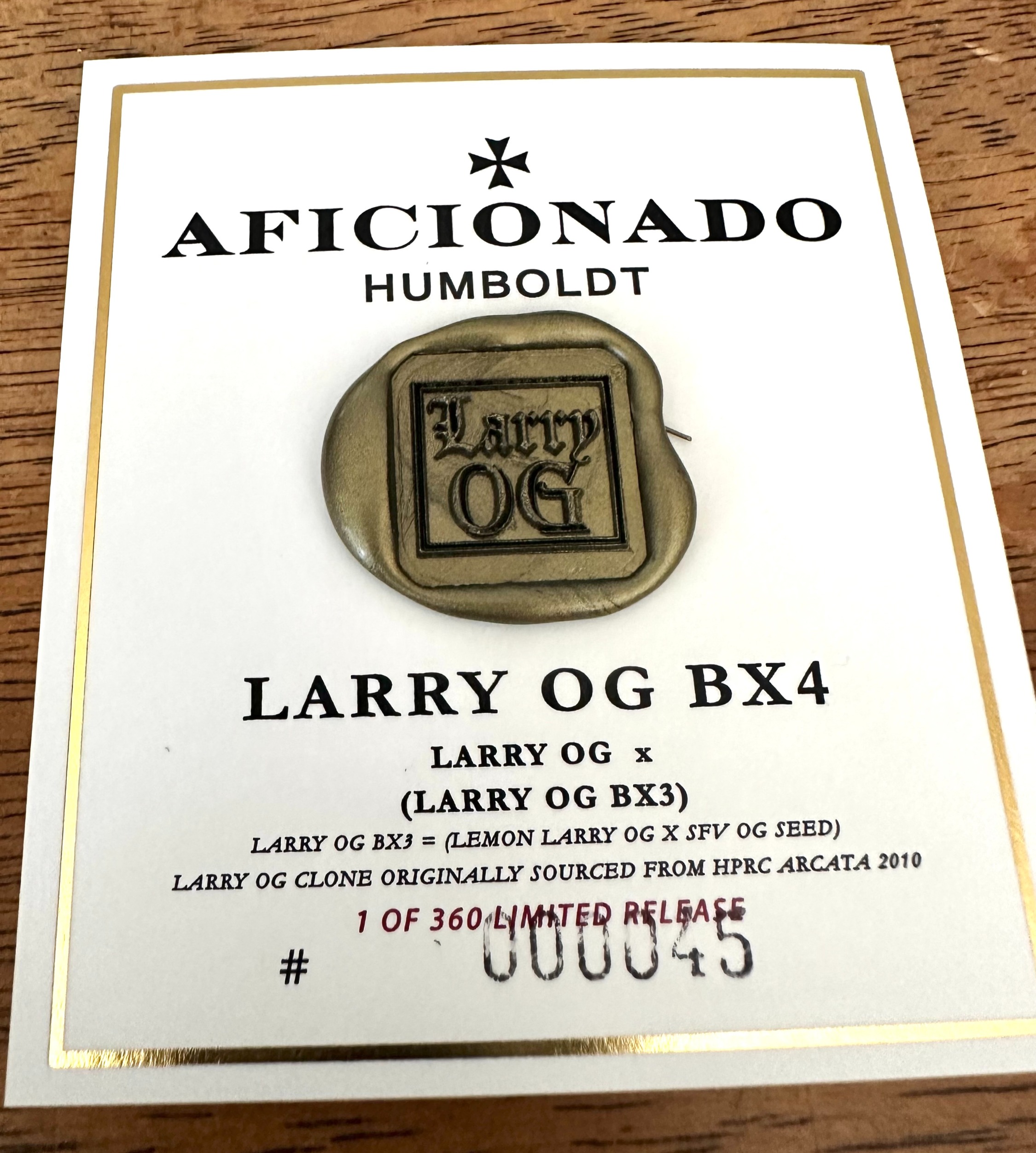 ? Strain Overview: Larry OG BX4 is special release deeply rooted in the history of Aficionado. Its story begins in 2010 when the original Larry clone was sourced from HRPC Arcata. In 2012 when OG Mike, an experienced breeder and mentor, paired it with an male of seed stock called (SFV) 818 OG. The goal of the Larry BX project was mainly to preserve the distinctive characteristics of the Larry OG in seed form. The Larry OG was known for its remarkable large bud structure, a rarity among OG cultivars. Their mission was to maintain this unique trait while also preserving the potent and classic OG aroma that enthusiasts cherish, as well as a strong outdoor and greenhouse producer while maintaining key classic OG growth characterisitics.