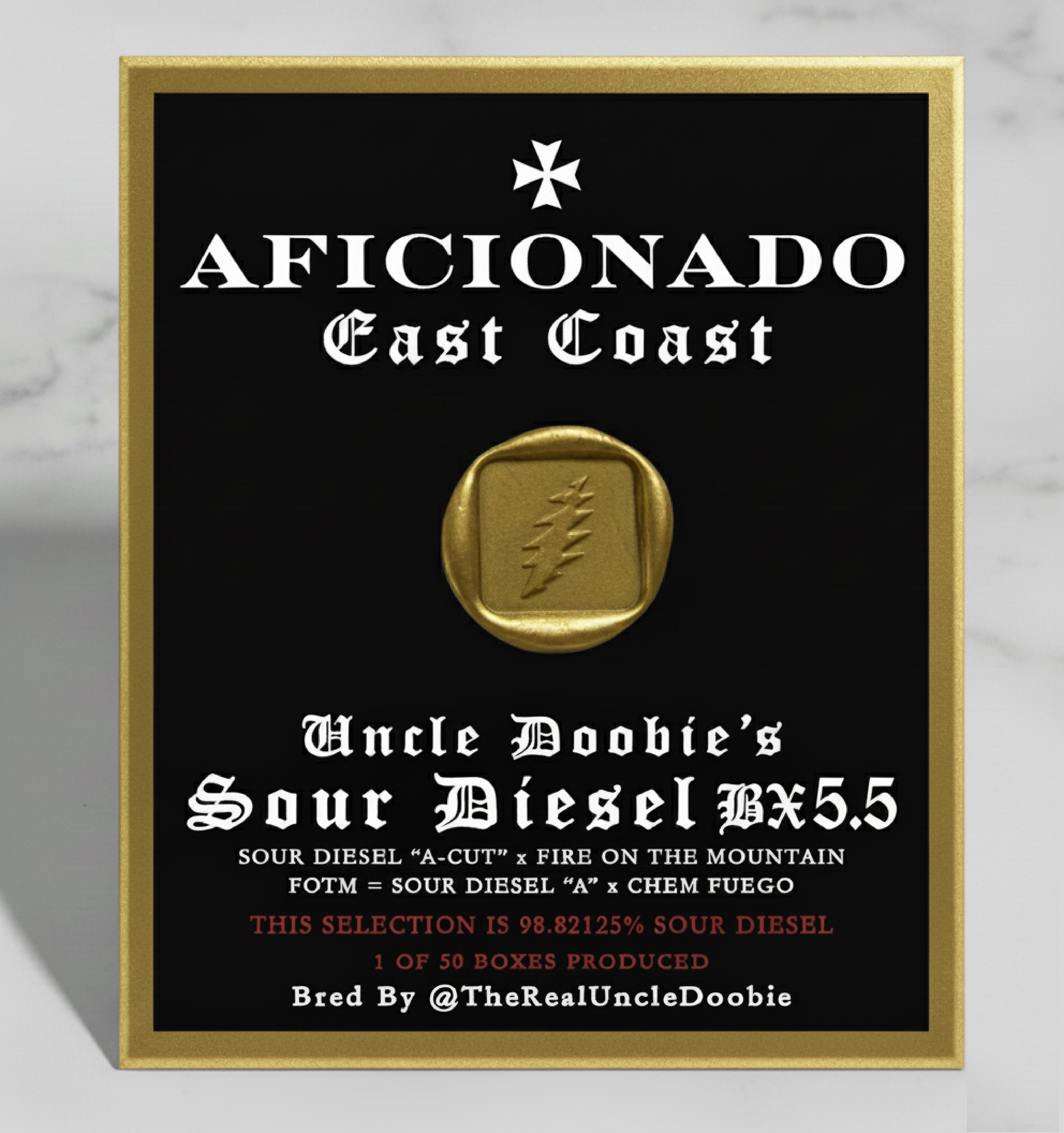 Uncle Doobie’s Sour Diesel BX5.5 is the final result of five full breeding runs of backcrossing carried out over a period of five years, all centered around the most revered Sour Diesel ever circulated: the Sour Diesel “A” Cut. This is the cut unanimously recognized by the Chem family, the original Sour circle, and every East Coast OG as the end-all, be-all expression of real Sour Diesel.